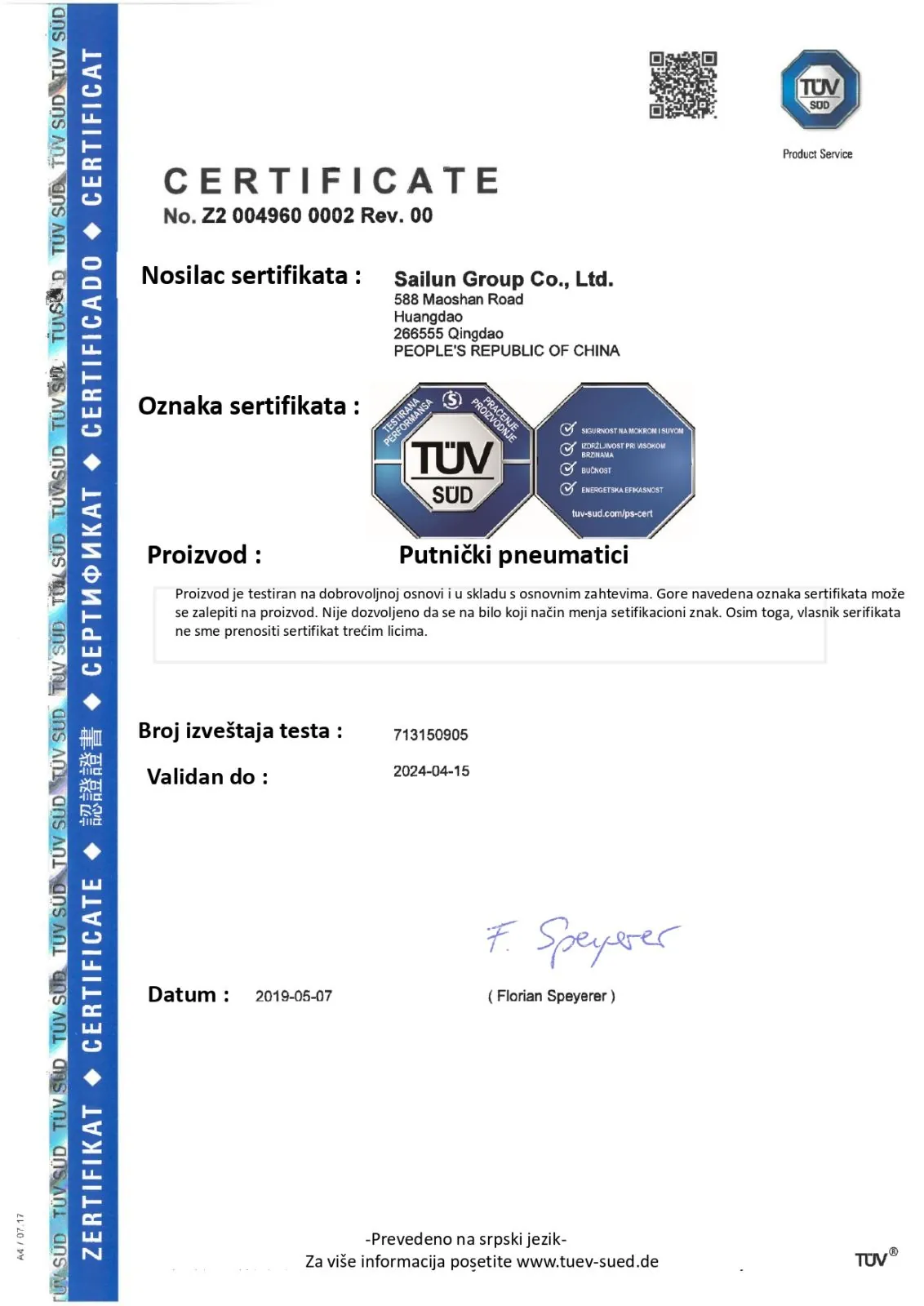 Sailun poseduje TUV sertifikat za kvalitet za putničke pneumatike!